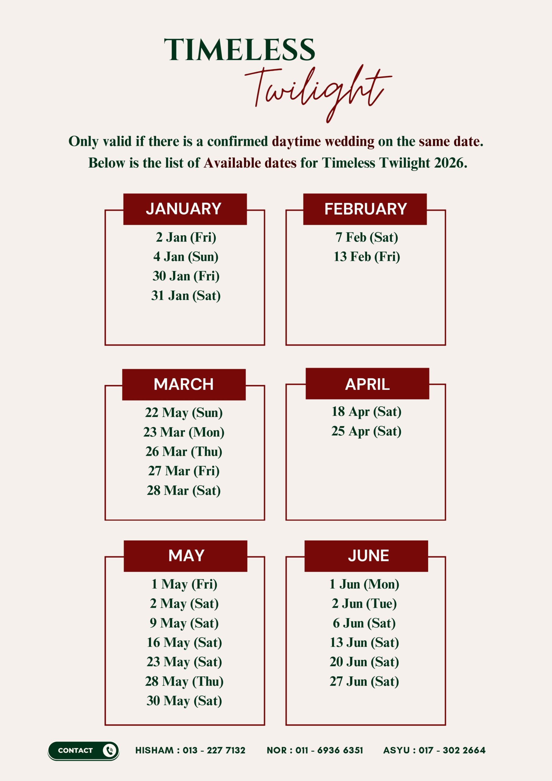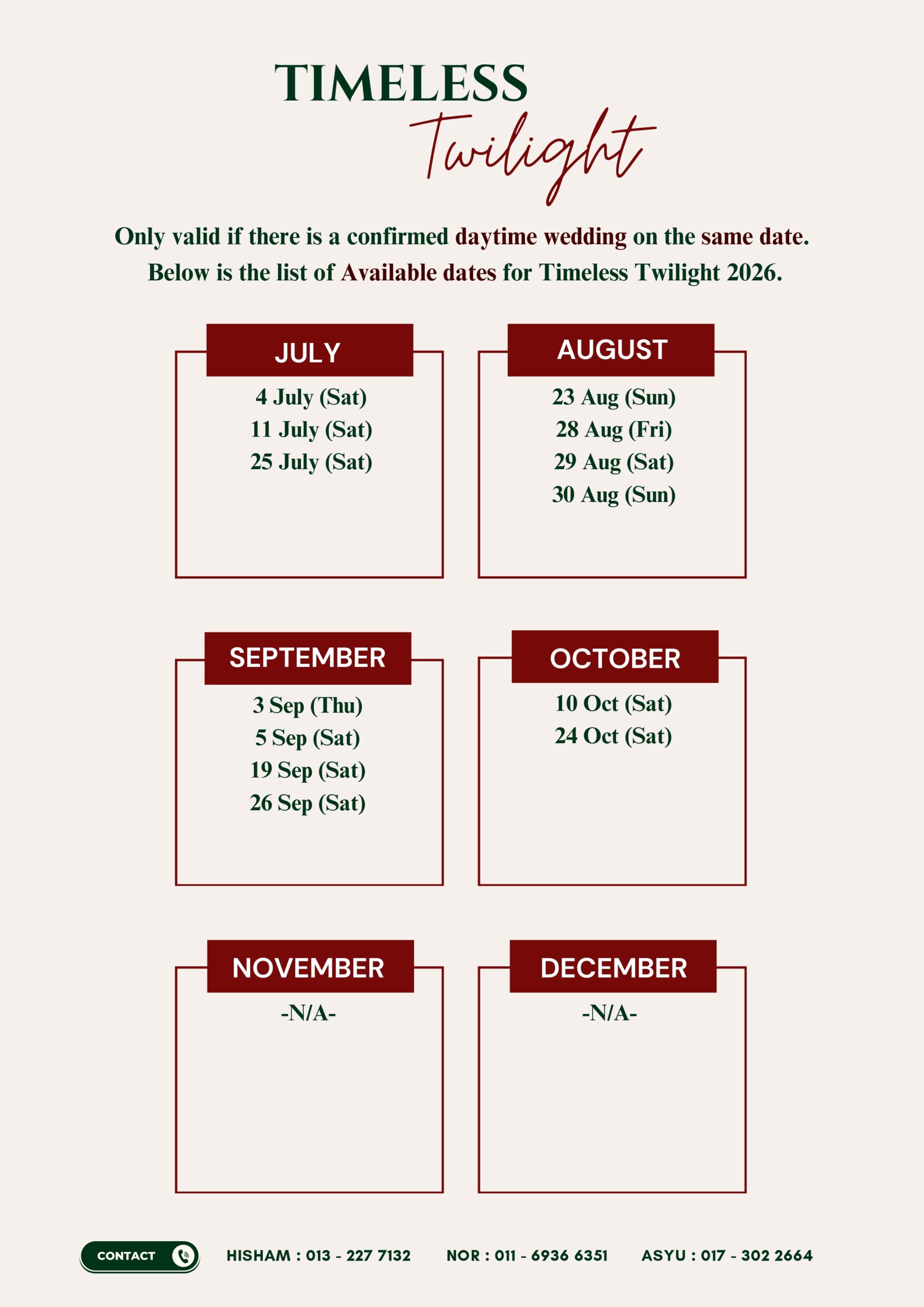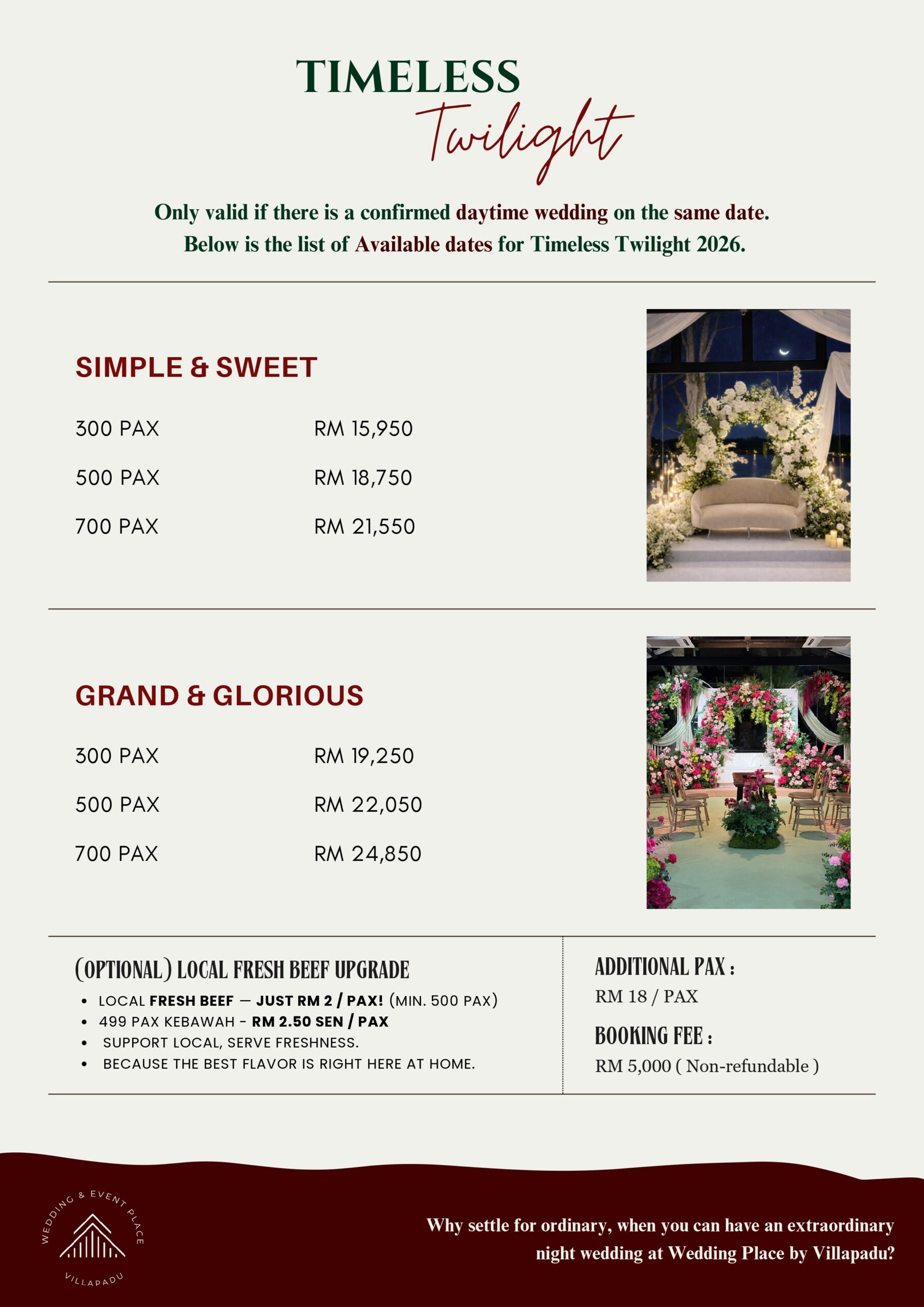 Price is calculated per person (pax). Extra pax refers to attendees beyond those included in the selected package. Example: If the package covers 300 pax and the event has 400 pax, the extra 100 attendees are counted as extra pax.
